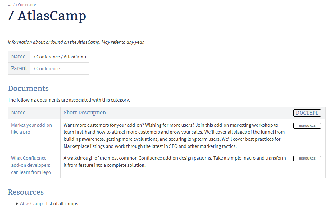 The category is itself documented by a document. The document automatically lists all documents associated with it. The following example shows the document for the category 'AtlasCamp'. The example shows two documents attached to this category.