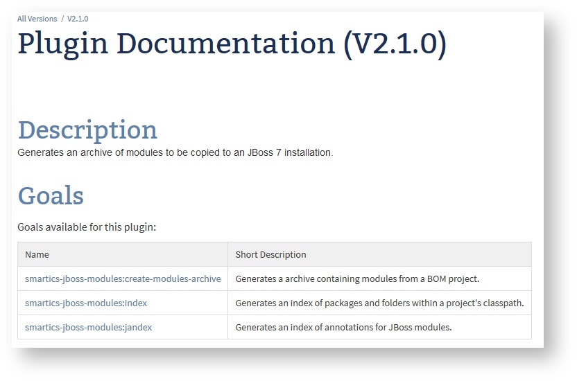 This plugin references three mojos that present their supported parameters by navigating to the mojo page.