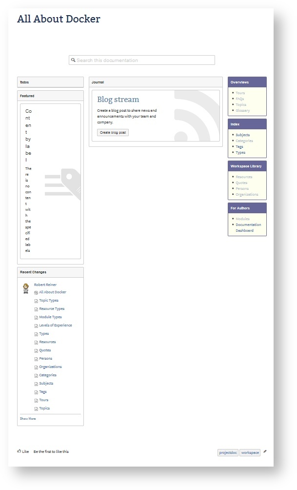 These spaces are designed to be used by beginners. Advanced users may define there own space blueprints. The following two sections introduce space blueprints based on the projectdoc add-on that you may install for free. Even the source code is available on Bitbucket so that you can fork them and adjust them to your specific requirements.