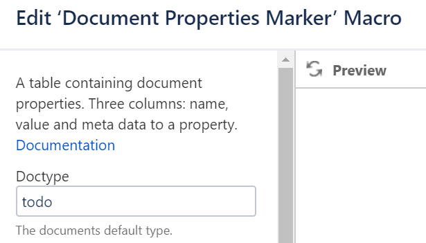 Since Nameless Documents the name of a projectdoc Document may be derived from the Title. Since the title is mandatory for a Confluence page, the only property still required being part of the table within the Document Properties Marker Macro was the Doctype.