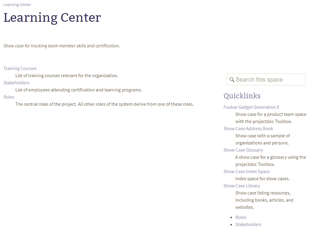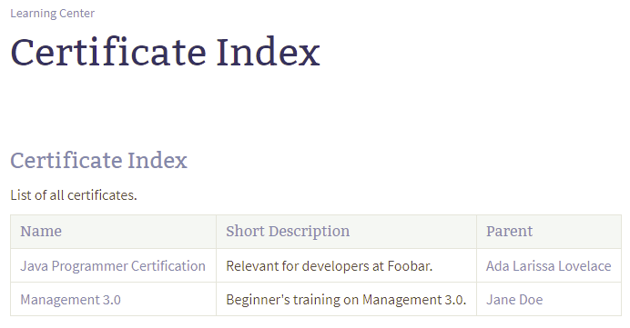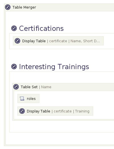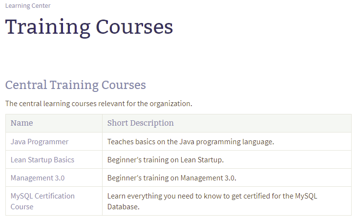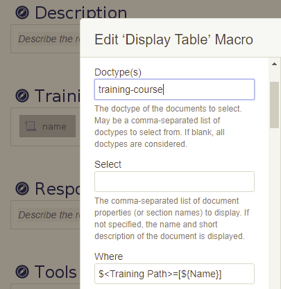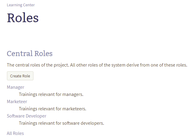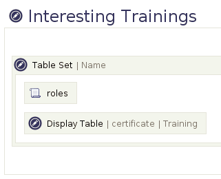 Roles define the training paths that are available for people in given roles. Since we do want to show new courses automatically on the role's page, there is a Display Table Macro to collect them. A new course specifies the roles it appeals to. This way there is no need to open another document when a new learning course is added.
