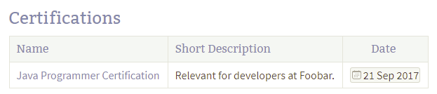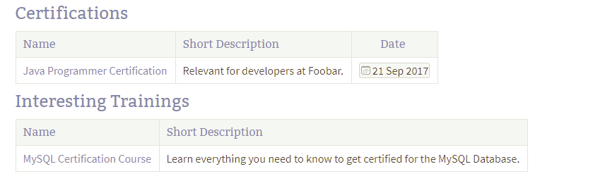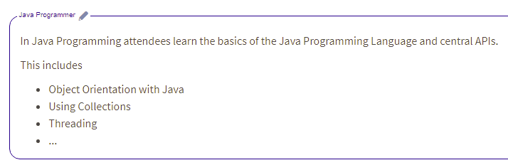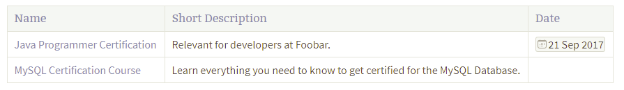 The courses could themselves link to skills they provide for the attendees. For this show case we simply lists skills (if any) as bullet lists.