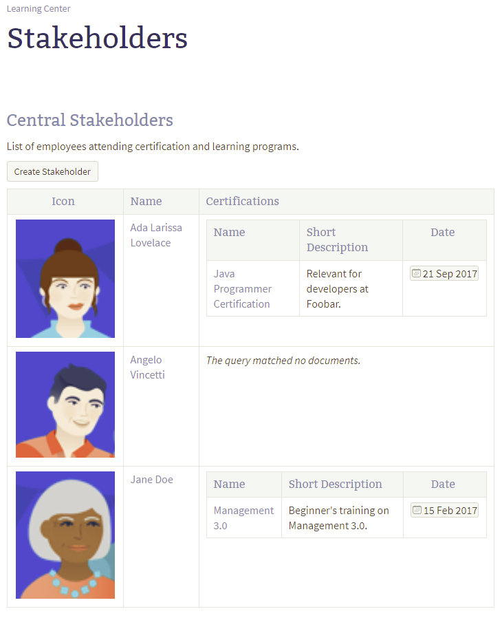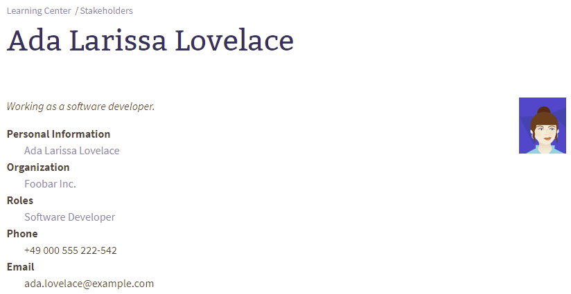 As you can see there are multiple stakeholder instances in different spaces for the same person. That indicates the different responsibilities a person has in different projects or contexts (like training). A stakeholder document is a view on an organization member in the context of a project or organizational issue.