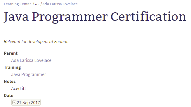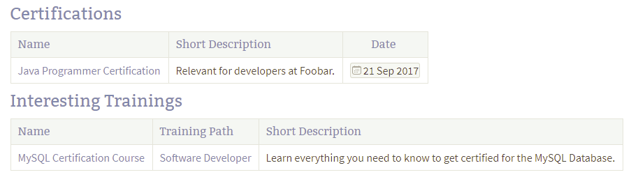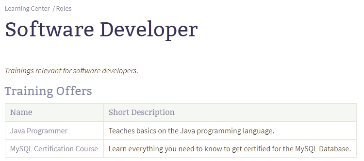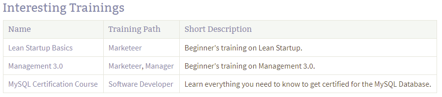 Once Larissa gets excited on marketing stuff and there is assigned the role of a marketeer in addition to her current software developer role, then the new training courses are shown as relevant on her page.
