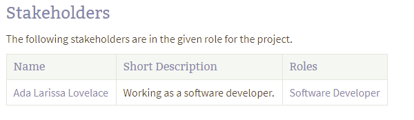 Click Stakeholders for the list of stakeholders and then select the employee you need the information for (e.g. Ada Larissa Lovelace).