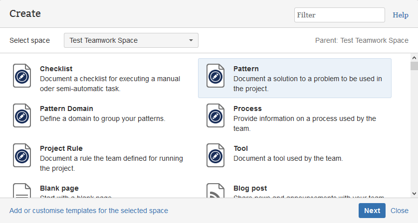 And for this space only, the 'Pattern' template is no longer shown in the wizard.