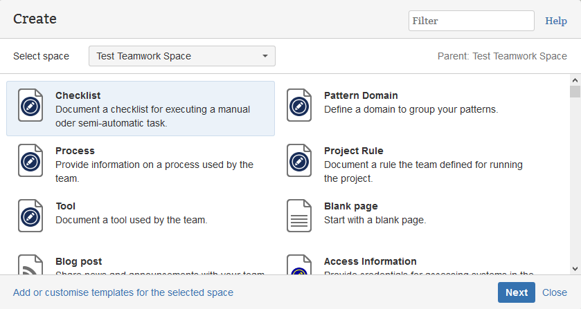 The projectdoc Toolbox supports template authors to create blueprints. There are quite a large number of blueprints based on projectdoc available on the Atlassian Marketplace and on Bitbucket. Page authors may be overwhelmed by these many blueprints and left unsure about which template they should choose.