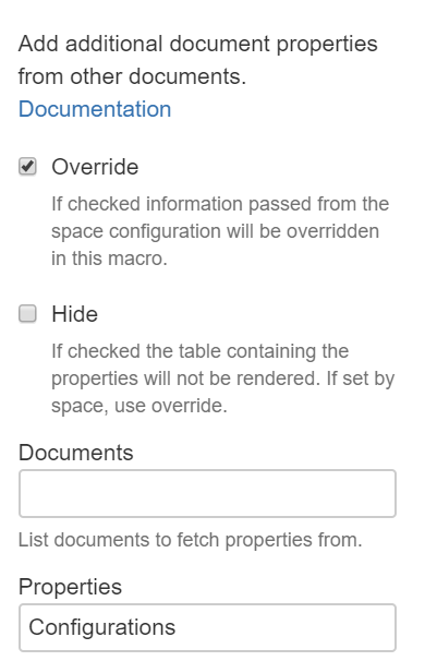 Next add the Document Properties Supplier From Documents Macro to a section of the service document. Point the Properties parameter to the Configurations property on the same page by leaving the Documents parameter empty.