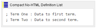 Renders wiki syntax as a definition list. Does not allow any HTML tags.