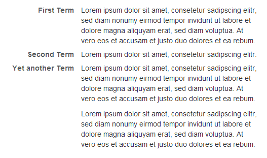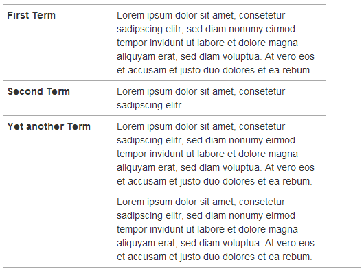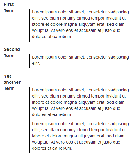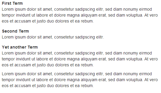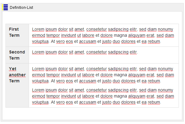 Renders term and definition information as a definition list. Currently Conflucene does not easily support authors to write definition lists. But definition lists allow to render this form of information efficiently.