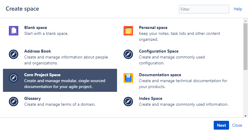 Create a space to organize information for your agile team. A basic structure with homepages is created, such as for tags, topics, or roles).