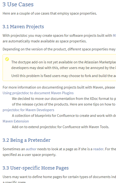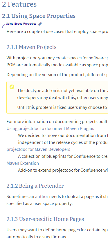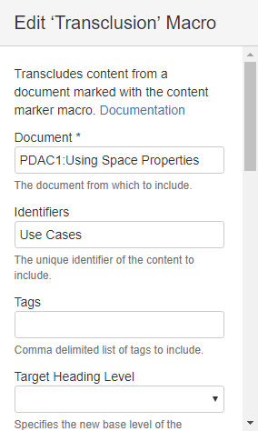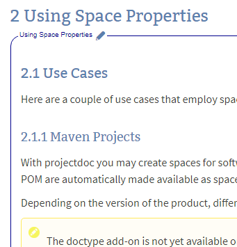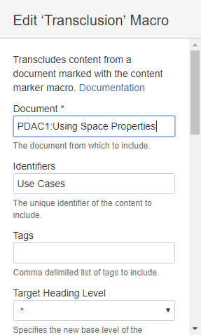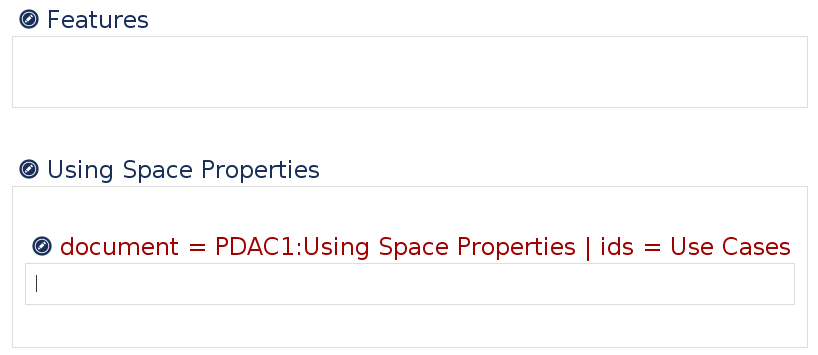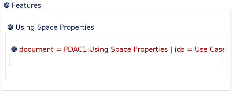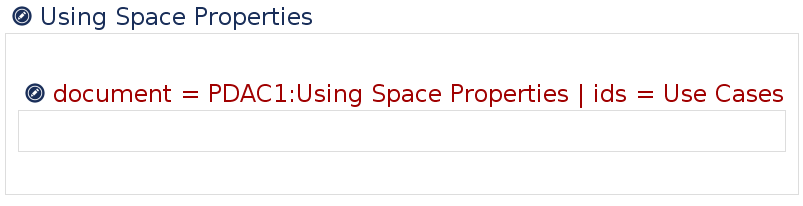 Now let's assume we need to include the use cases section on another page. There we have already a section titled 'Using Space Properties" and now need to transclude the content. The section in the page is at level one (the section is not contained in another section) and at position two (there is one section as a sibling in front of this section).