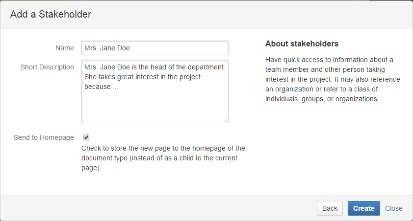 You may choose to document stakeholders as Roles, Persons or Organizations. The Stakeholder documents reference the basic data and allows to store information about the interests of the stakeholder for your project.