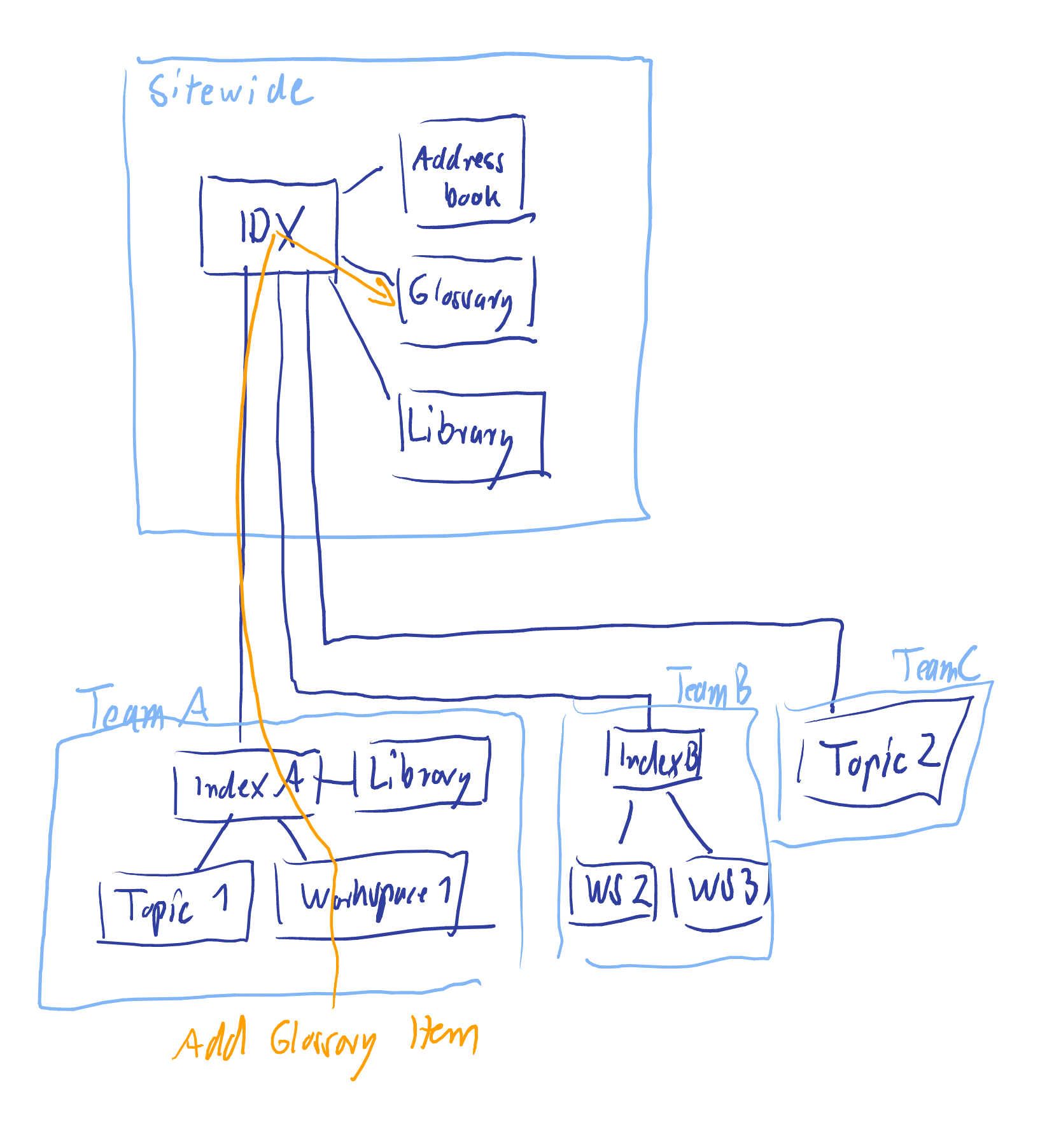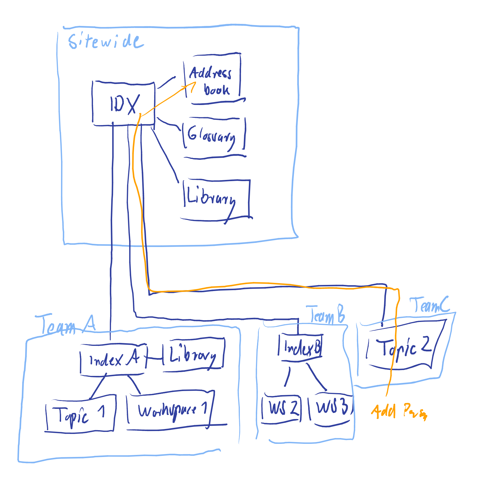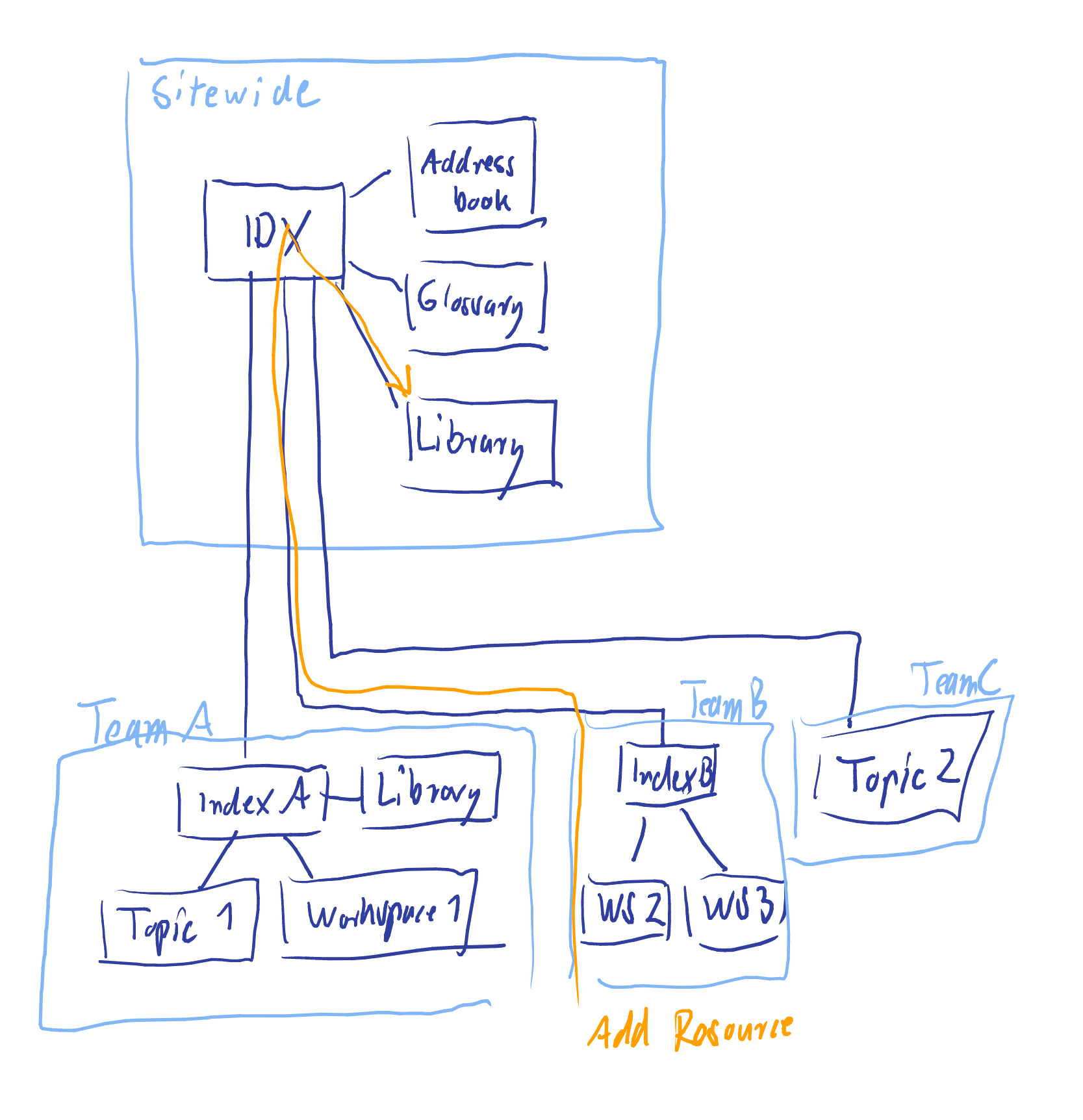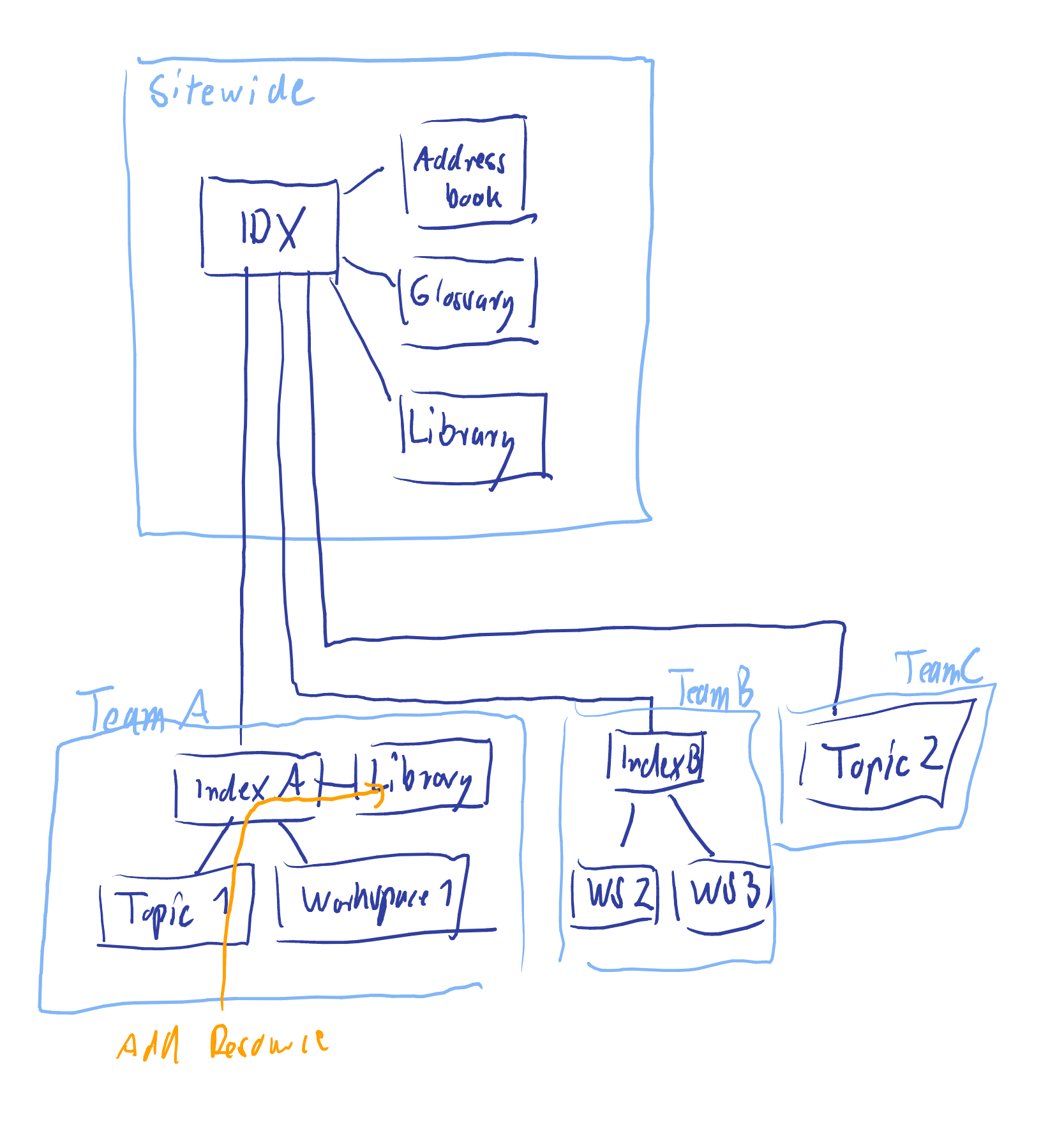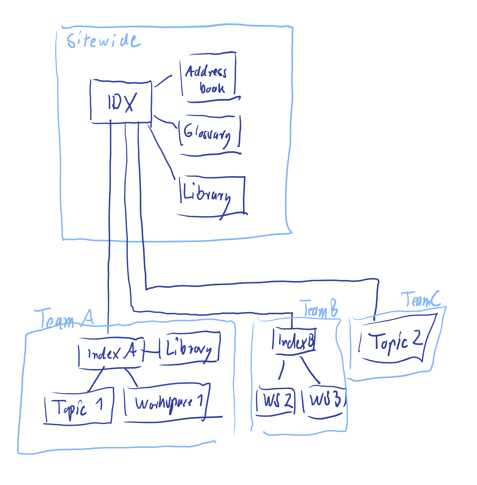 Three teams use the sitewide index space with three attachment spaces. Team A decided to have an index space and an attachment space on their own. Team B only needs a configuration space (Index B), and Team C only uses a single topic space for their collaboration results.