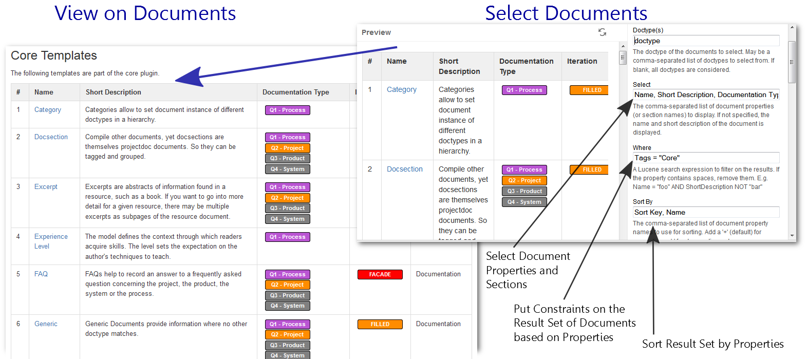 - Renders a predefined list of documents in a table . Documents are selected by a document property. Allows to select document properties for columns. Also non-list representations are provided.
