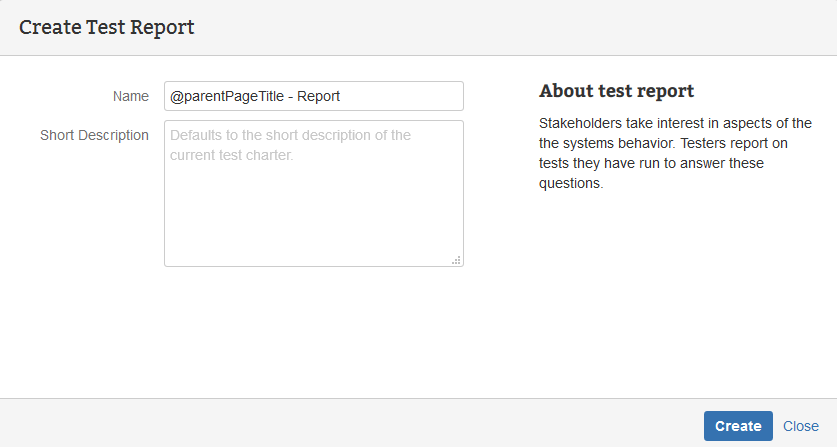 On creation of the test report document you typically do not need to add any information to the wizard. Just click 'Create'! If you change your mind, you may rename the document or edit the short description later.