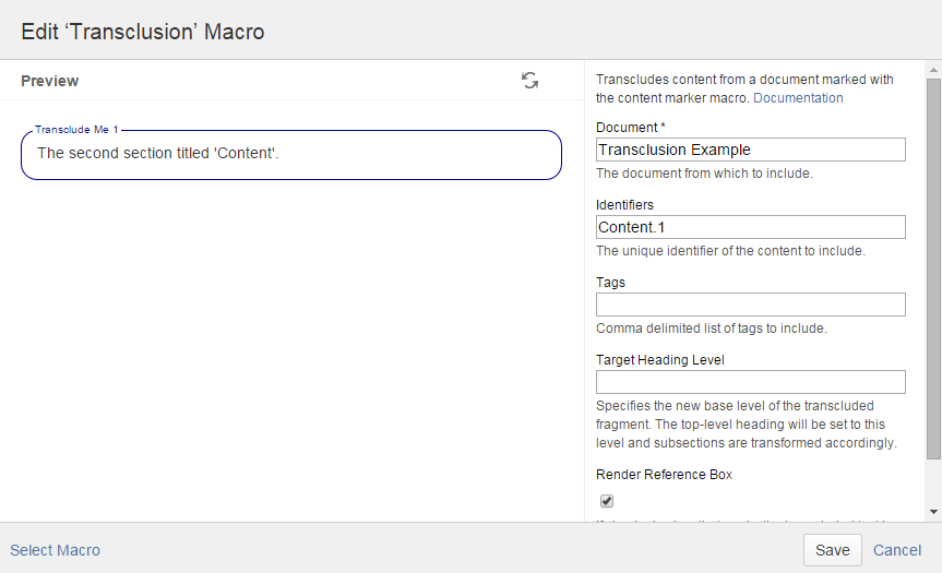 Transcludes content via a reference from a document marked with the content marker macro. | Allows to transclude from a referenced document. |