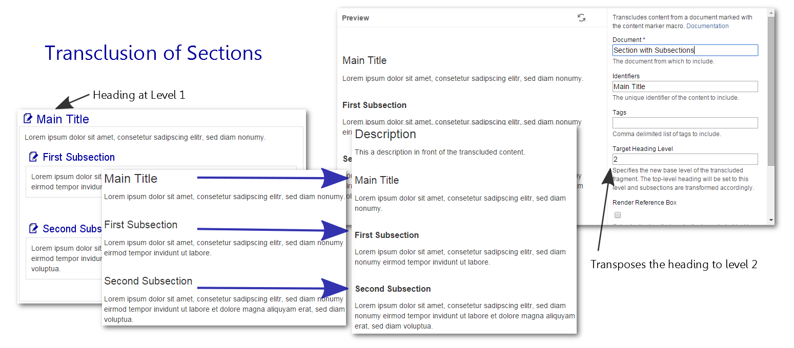 This modifier allows to render a section with subsections within another page adjusted to the target's heading level.