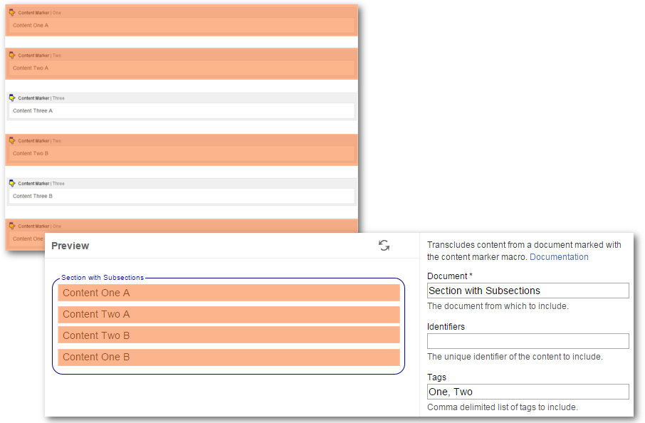 Transcludes content from a document marked with the content marker macro and renders it as plain text. | Allows to render the transcluded content as plain text. This may be further processed by other macros, such as the Body Graph Macro. | |