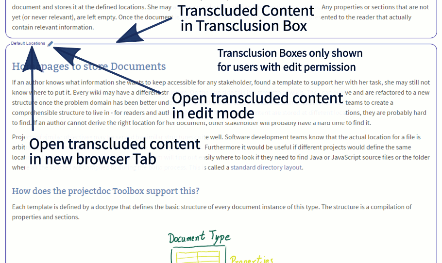 - The projectdoc Toolbox provides a number of features to help teams to reuse content. Content can be transcluded individually or in form of a multitransclude. Authors can even transclude content from multiple documents in the wiki, effectively combining transclusion with automatic lists.